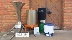 - Den innehåller: 4 fruktkorgar, 1 fruktkvarn, 1 rostfri hink, 1 vattendriven fruktpress, 90 l med 1 filtertyg, 2 pastörer inkl. lock (olika volymer), 1 kapsylsförslutare till 26 och 29 mm kapsyl, 1 bag-in-box-hållare till tappningen